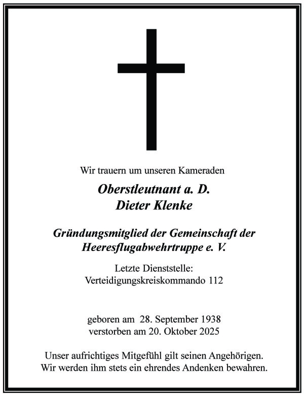 Oberst a. D. Klaus Peter Kuhlen, Vizepräsident der Gemeinschaft der Heeresflugabwehrtruppe e.V. und bis zu unserer Auflösung im Jahr 2012 letzter General der Heeresflugabwehrtruppe, hatte die schwere, ihn besonders psychisch fordernde Aufgabe, unsere Truppengattung aufzulösen. Die für uns alle völlig überraschende Entscheidung des Inspekteurs des Heeres zur Wiederaufstellung der Heeresflugabwehrtruppe hat seinen damaligen Kampf für uns alle nach mehr als zehn Jahren bestätigt. Nun ist er am 26. Mai 2025 plötzlich und völlig überraschend für immer von uns gegangen. Möge er unser aller aktives Mitwirken bei der Aufstellung immer wohlwollend beobachten. Lesen Sie den Nachruf unseres Präsidenten in der Ausgabe III/2025 des BOGENSCHÜTZEN ab Seite 8.