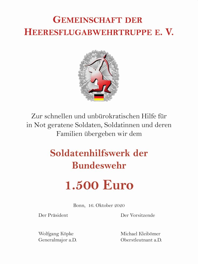 Nachdem wir im Corona-Jahr durch den Ausfall unseres Tages der Heeresflugabwehr in Regensburg und durch die Änderung der Durchführung von drei Vorstandssitzungen hohe Einsparungen gegenüber dem Haushaltsplan hatten, haben wir uns entschlossen, die Einsparungen zu spenden und das Soldatenhilfswerk der Bundeswehr mit einer Summe von 1.500 Euro zu unterstützen.