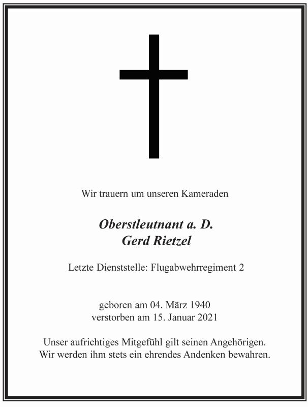 Am 15. Januar 2021 ist unser Mitglied Oberstleutnant a.D. Gerd Rietzel verstorben. Unser tief empfundenes Mitgefühl gilt seinen Angehörigen. Die Trauerfeier fand am 21. Januar 2021 in Esens statt.