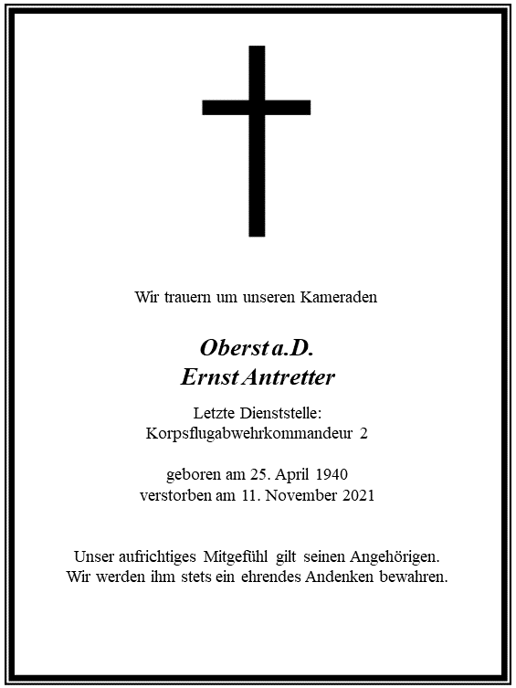 Am 11. November 2021 verstarb im Alter von 81 Jahren unser Mitglied Oberst a.D. Ernst Antretter.
