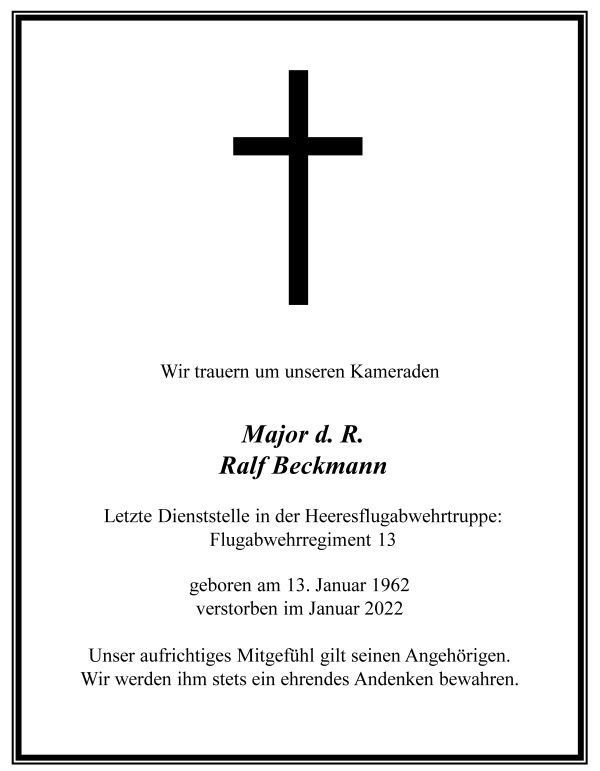Im Alter von gerade einmal 60 Jahren verstarb unser Mitglied Major d.R. Ralf Beckmann.