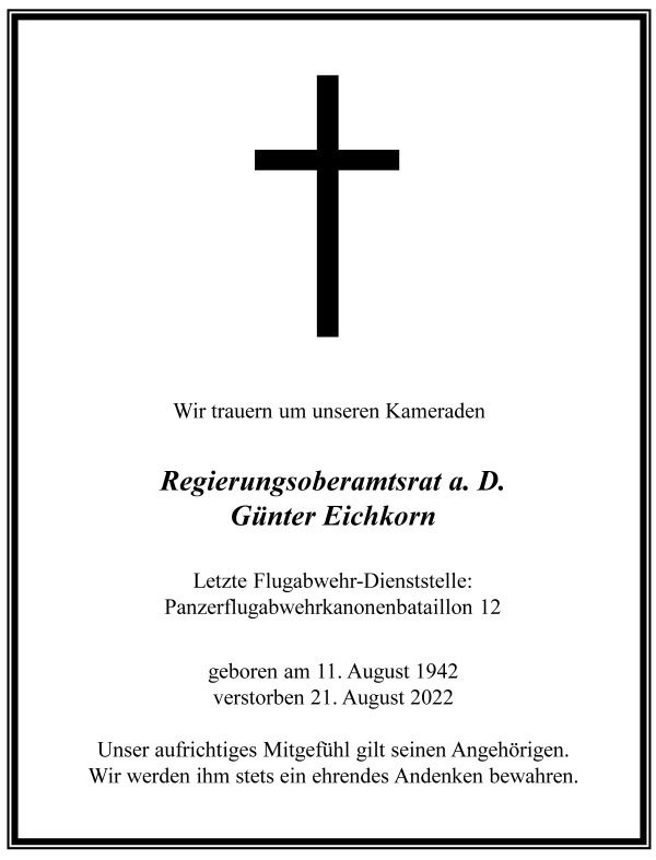 Am 21. August 2022 verstarb unser Mitglied Regierungsoberamtsrat a.D. Günter Eichkorn.